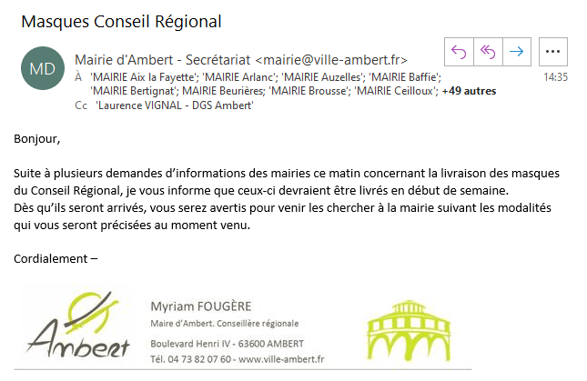Masques du Conseil régional : en attente d’information de la mairie d’Ambert ; pas plus de précisions pour le moment. Image Publié le 11 Mai 2020 par Michel SAUVADE Partager : Cliquer pour partager sur X(ouvre dans une nouvelle fenêtre) X Cliquez pour partager sur Facebook(ouvre dans une nouvelle fenêtre) Facebook J’aime chargement… Similaire