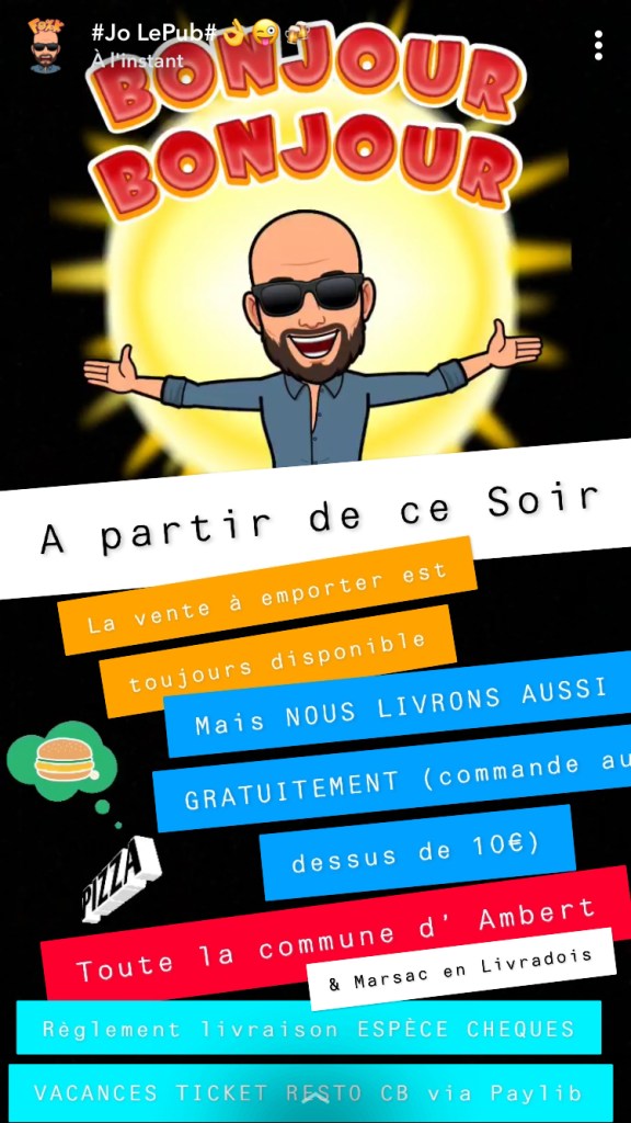 Le Pub livre à Marsac dès ce soir ! Image Publié le 9 juin 2020 par Michel SAUVADE Menu à retrouver sur la page Facebook https://www.facebook.com/barlePub63600/?ref=br_rs Partager : Cliquer pour partager sur X(ouvre dans une nouvelle fenêtre) X Cliquez pour partager sur Facebook(ouvre dans une nouvelle fenêtre) Facebook J’aime chargement… Similaire