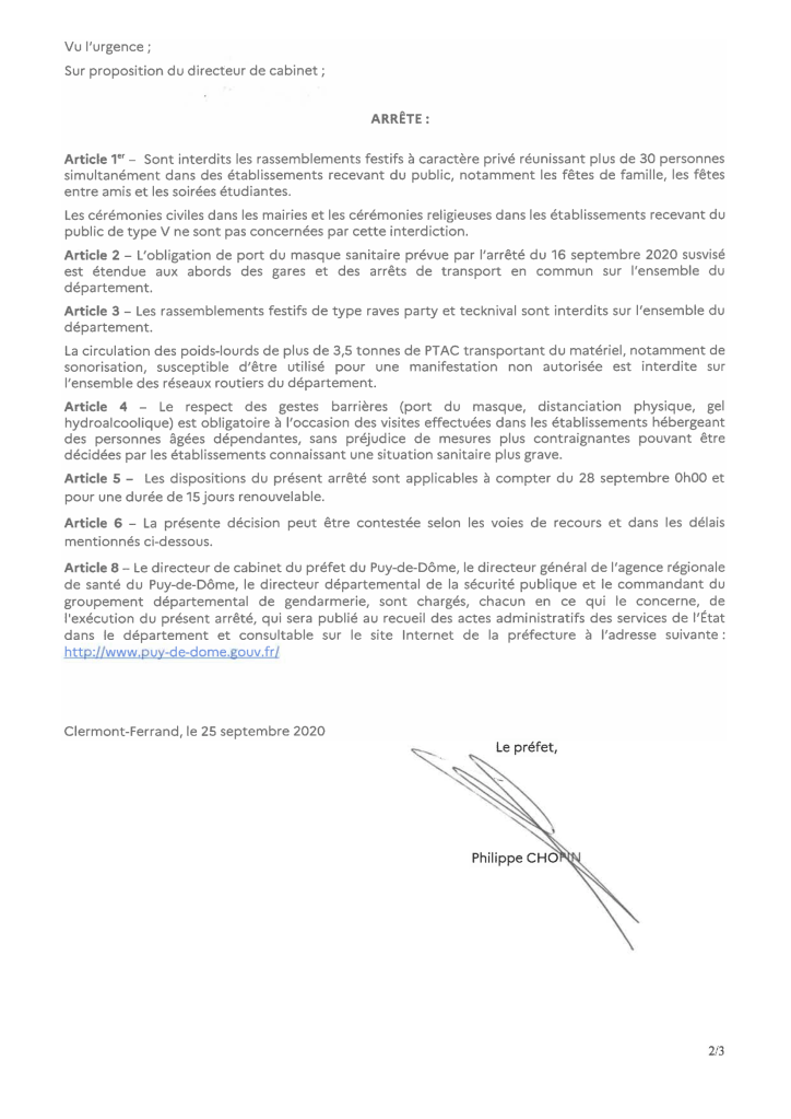 Une réflexion au sujet de « COVID 19 – Arrêté du préfet du Puy de Dôme applicable au 28 septembre. »