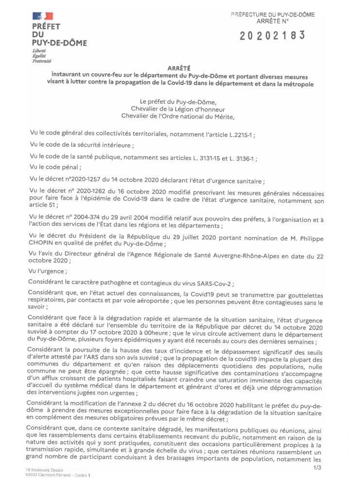 – les départements en état d’urgence sanitaire avec couvre-feu, dont le département du Puy-de-Dôme.