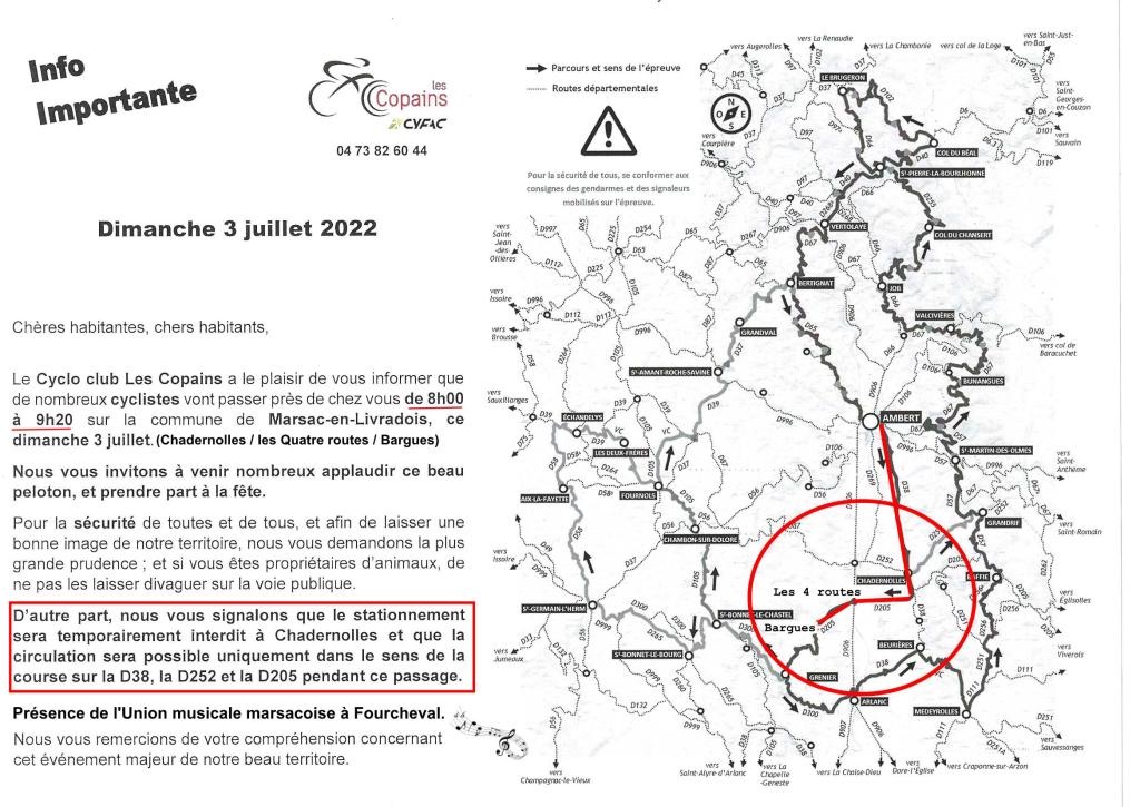3 juillet : Cyclo les Copains, informations importantes sur le passage de la course dans la commune. Image Publié le 27 juin 2022 par Michel SAUVADE Partager : Cliquer pour partager sur X(ouvre dans une nouvelle fenêtre) X Cliquez pour partager sur Facebook(ouvre dans une nouvelle fenêtre) Facebook J’aime chargement… Similaire