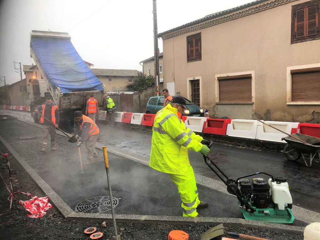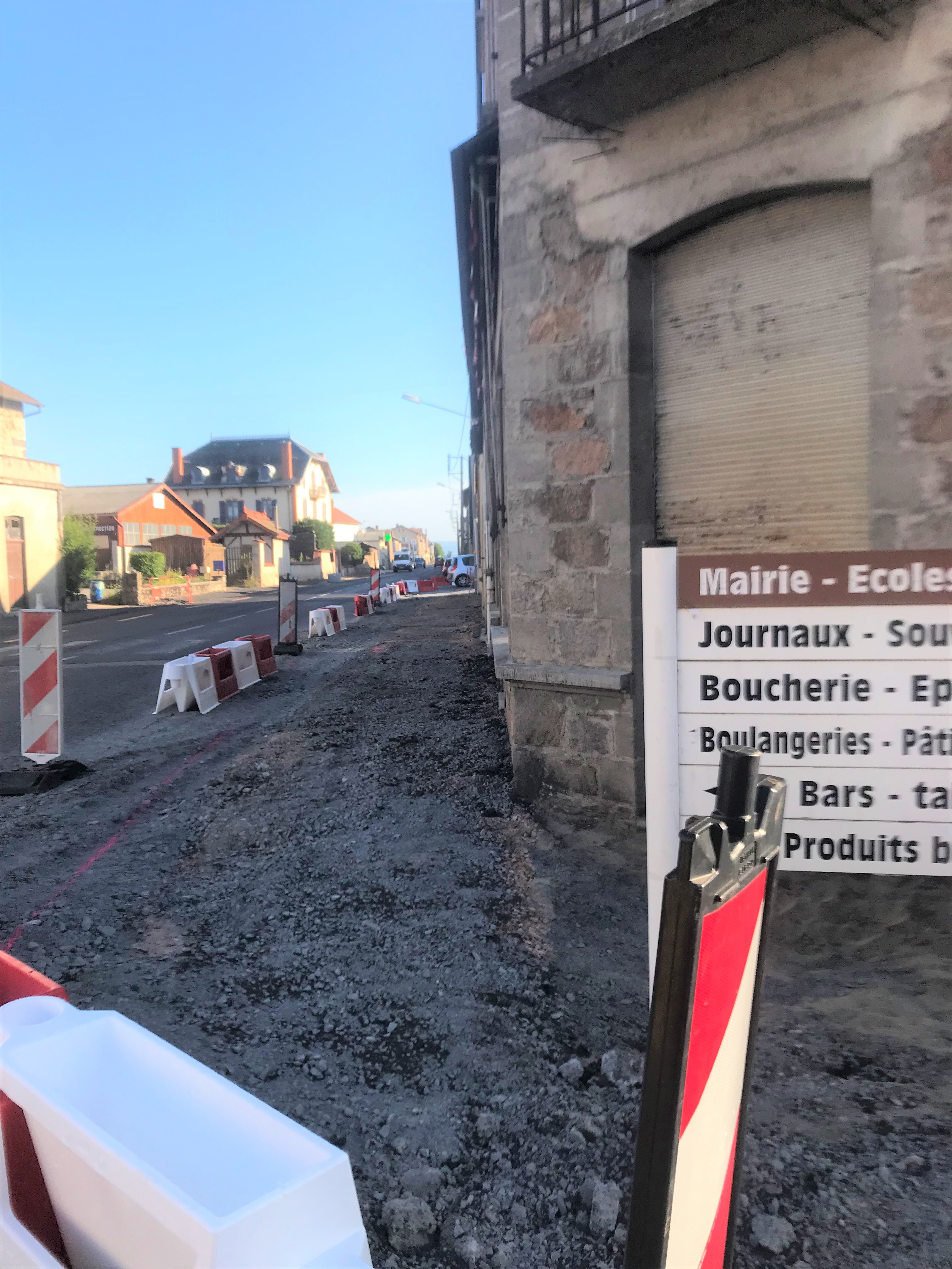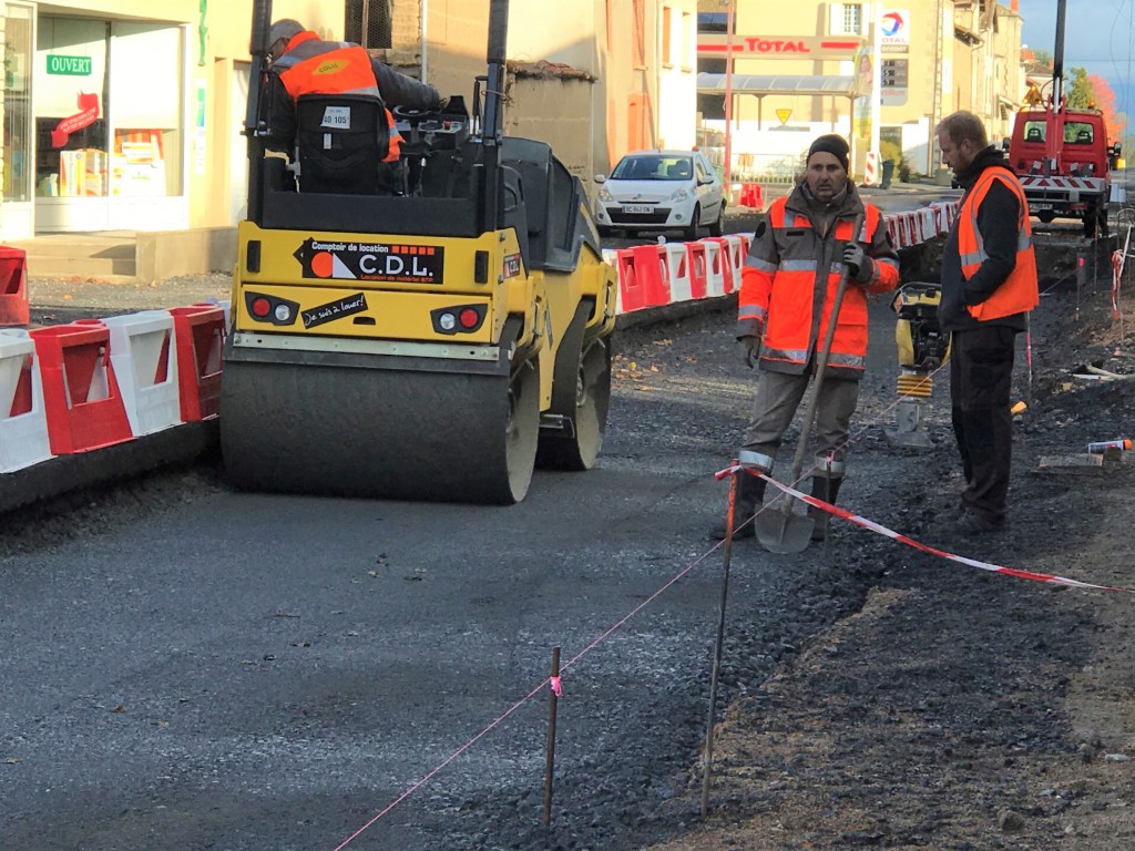 22 octobre 2019 : REUNION DE CHANTIER n° 10 : Les travaux côté « Livradois » sont achevés ; les places de parking ont été réalisées afin de ne pas pénaliser davantage la pharmacie. Les problèmes de raccordement entre le trottoir et les entrées du salon de coiffure et du hangar « Grenier » ont été résolus après accord avec les propriétaires. La société Orange, qui n’est quasiment jamais présente aux réunions de chantier provoque des retards en raisons de réseau mal signalés ou mal implantés.