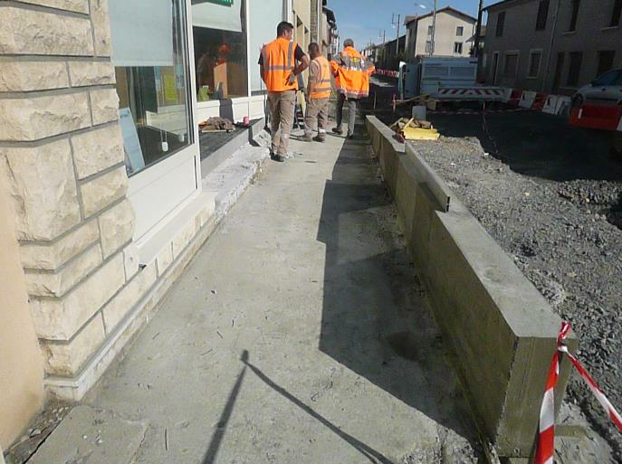 8 octobre 2019 : REUNION DE CHANTIER n° 8 : la rampe devant la pharmacie est terminée, il reste le garde-corps et les finitions. La création des massifs pour l’éclairage public est en cours.
