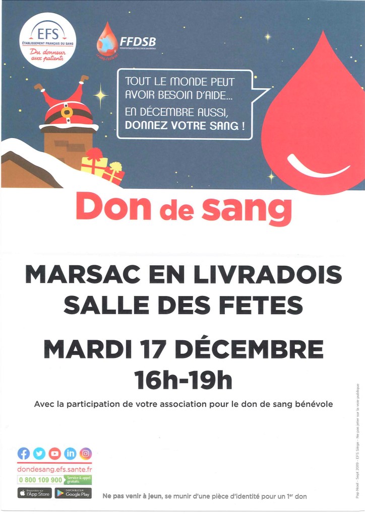 Mardi 17 décembre : Don du sang à Marsac en Livradois